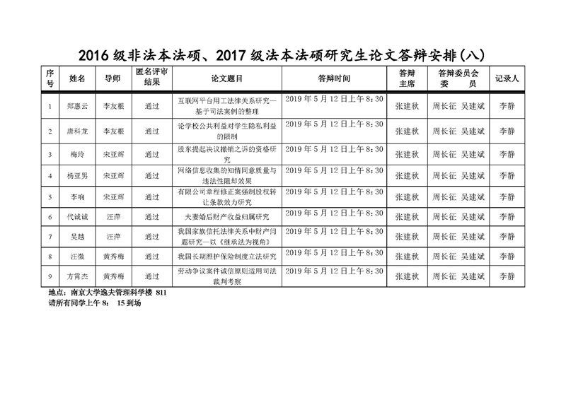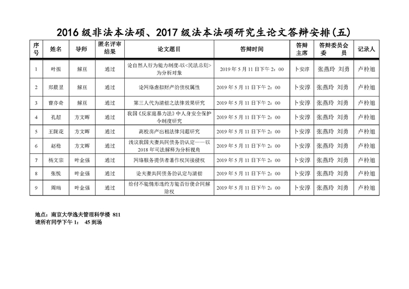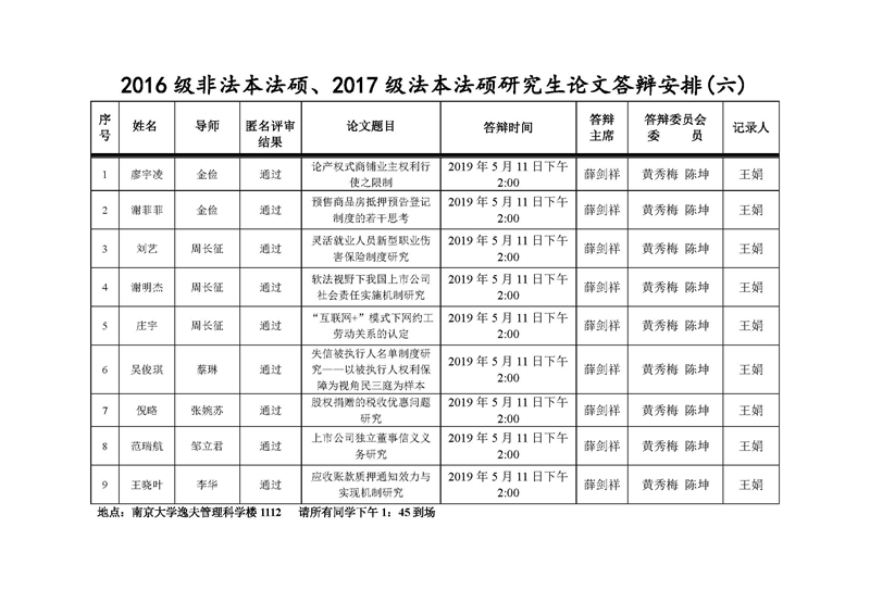 2016级非法本法硕、2017级法本法硕研究生论文答辩安排