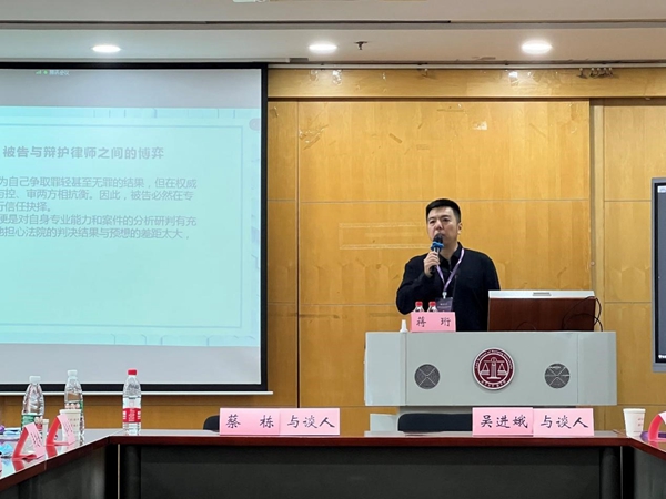 司法鉴定专业硕士研究生王强同学进行发言报告。江苏省镇江市中级人民法院刑一庭庭长、四级高级法官孙海燕博士,南京森林警察学院副教授闾刚博士围绕报告内容与谈交流。