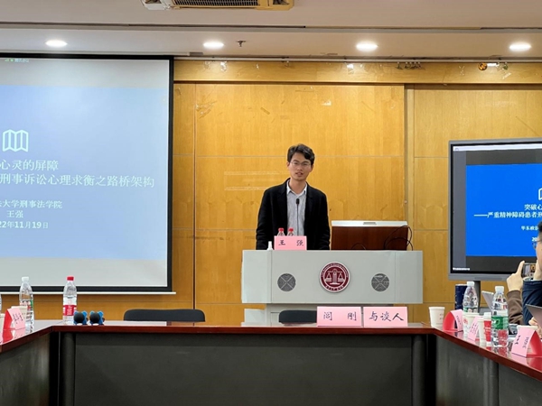司法鉴定专业硕士研究生王强同学,其报告题目为《突破心灵的屏障——严重精神障碍患者刑事诉讼心理求衡之路桥架构》。他认为严重精神障碍患者刑事案件中,各诉讼参与人存在不同心理:被告人可能存在悔罪、侥幸抵赖、依赖、抗衡的心理,法定代理人可能存在气愤、无奈、焦虑甚至绝望的情绪,辩护人会产生同情、对自己人身安全的担忧、对被告人表现的焦灼等复杂心理,被害人一般会表现正常,也可能对被告人产生恐惧、报复或是同情的情绪。基于以上情况,法官要承担作为法律人、社会人的责任,引导、转化公诉人的优越、矛盾冲突心理,通过举证来应对被告人的抗拒狡辩心理,面对受害人的强烈情绪,法官需保持理性,面对法定代理人与辩护人将“精神病”认为是无罪理由的错误观点,法官需提醒并阐述判决理由。同时,在庭审与执行两环节开展全方位心理融通:在庭审中,表现出诚意、理解,向各方分别说理阐述,实现共赢;针对强制医疗执行程序中的不足,法官需进行效力上的把控。其次,法官需进行心理矫正之架构衔接:在诉讼前,积极引入精神障碍患者心理评估机制;在诉讼中,借鉴精神卫生法庭模式,集合各方力量加强沟通;在诉讼后,增加判后心理调适环节。