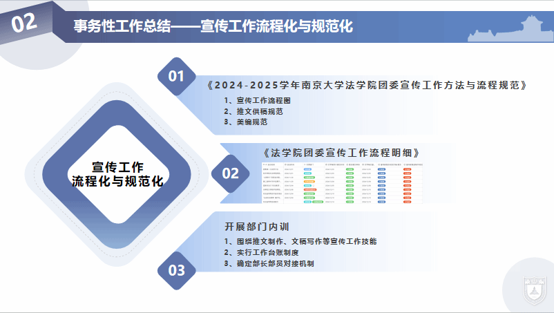 团委宣传工作方法与流程规范》,在宣传工作流程、推文供稿规范以及美编规范等方面作出具体细致要求。为进一步提高宣传工作效率,宣传部制作《p站视频