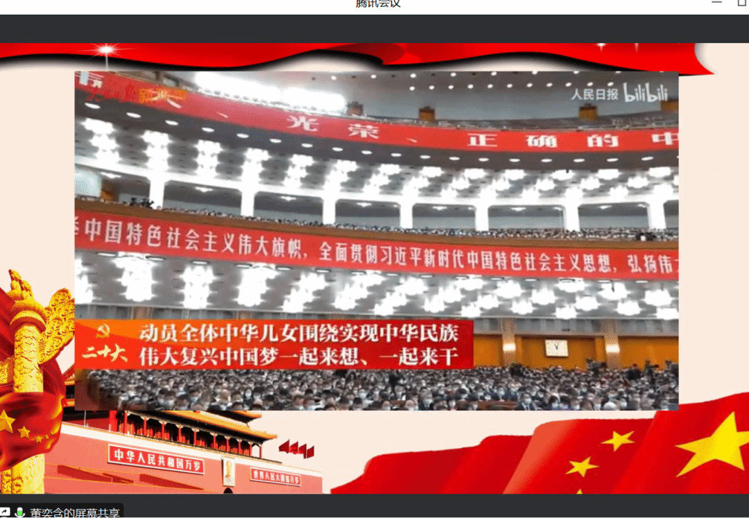 本次主题教育活动由团支部副书记董奕含同学主持。活动第一部分,董奕含同学播放了习近平总书记在党的二十大报告中的金句集锦视频。习近平总书记的讲话高屋建瓴、高瞻远瞩、内涵丰富、充满哲思,为我们未来的学习工作提出了要求、指明了方向。全体同学在认真观看的过程中,深入地学习到习近平总书记对国家发展的蓝图擘画与对青年成材的殷殷嘱托,深切地感受到习近平总书记的恢宏气魄、远见卓识、雄韬伟略。