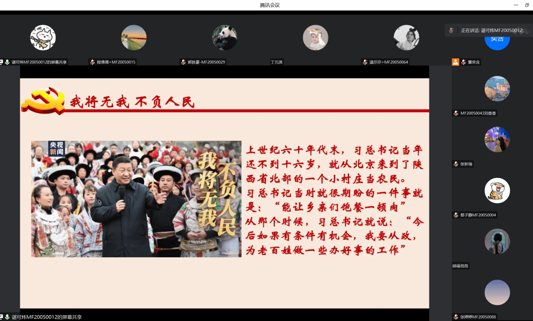 活动第二部分,三位同学代表发言分享自己的学习心得。团支部副书记谌可炜同学首先带头分享了自己关于“人民情怀”与“全过程人民民主”新理念的学习感悟。谌可炜同学以近期观看的《总书记的人民情怀》纪录片说起,从黄土地的小村庄到党中央,从农村大队党支部书记到党的总书记、国家主席,习近平始终胸怀家国,把自己当作人民的勤务员。为了人民的幸福,一往无前以赴之,夙兴夜寐以求之,不遗余力以成之。一件件小事、一份份牵挂,他把对人民最深沉的热爱,用行动凝聚为那一句铮铮誓言——我将无我,不负人民!坚持人民至上,将人民地位高高举过头顶,切实保障人民主体地位是我们党和国家始终坚持的理念,也正因如此“全过程人民民主”新理念应运而生,从选举到协商到决策到管理到监督,全过程人民民主是全链条、全方位、全覆盖的民主,是最广泛、最真实、最管用的民主。
