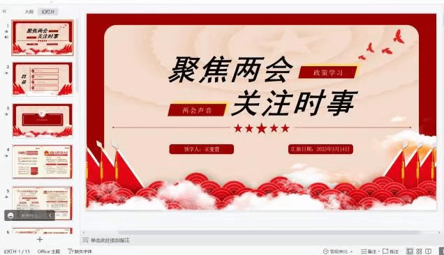 支部书记王雯萱同学首先从“两会基本知识”“2023两会看点”“政府工作报告具体内容”以及“新总理答记者问”四个方面带领大家进行集中回顾与学习。对诸如今年两会名称的规范性表述“十四届全国人大一次会议”“全国政协十四届一次会议”等重点理论内容予以了着重点明,对我国今年的经济增长目标以及大学生就业等与广大同学息息相关的重点话题进行了详细介绍。王雯萱同学领学后,各位同学围绕两会重点内容和集体学习内容进行深入讨论,并分享自己的学习成果。