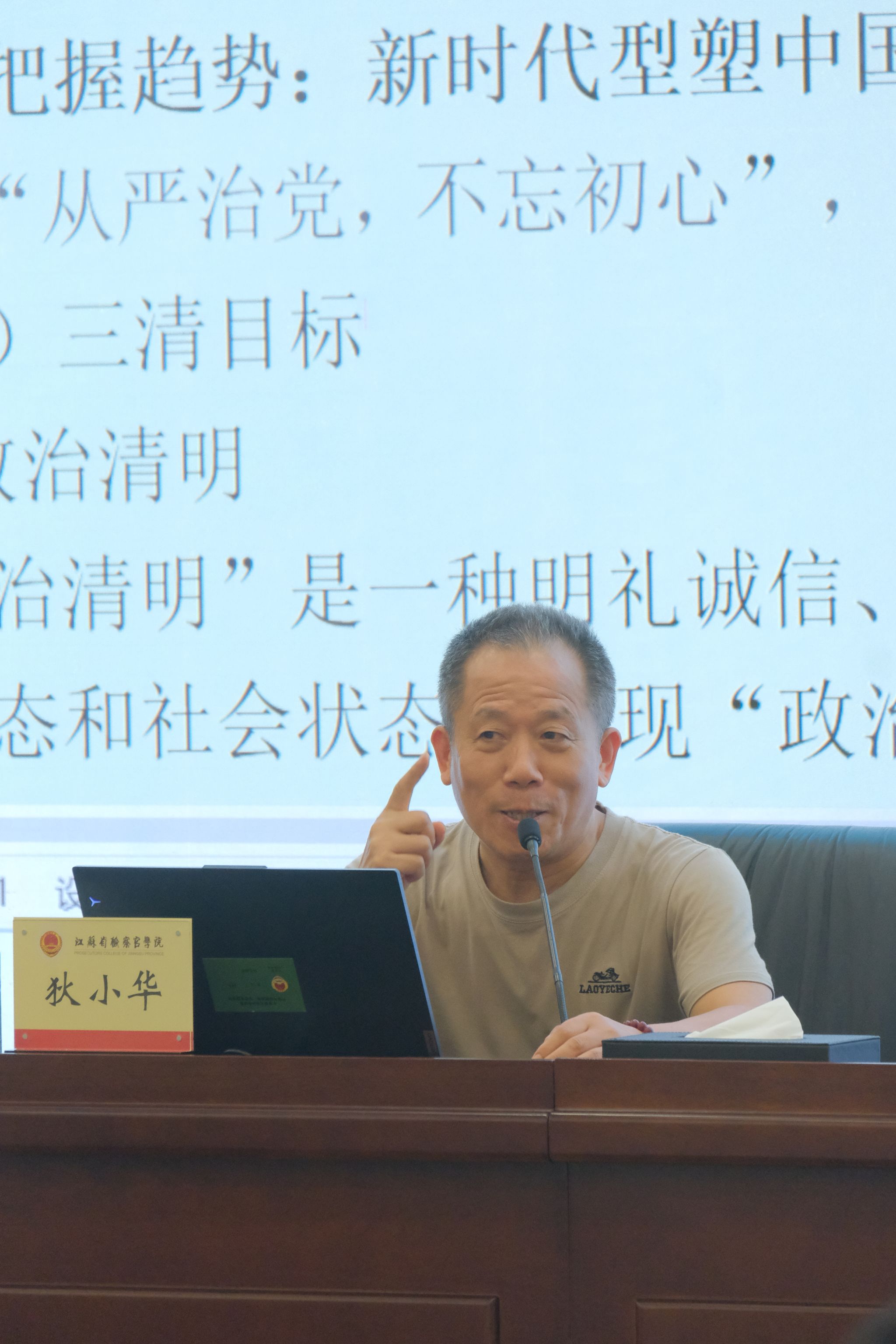 8月18日上午,p站视频 党委理论讲师团成员、p站视频 教授狄小华为师生学员作“新时代反腐倡廉新模式”专题授课。“腐败是危害党的生命力和战斗力的最大毒瘤,反腐败斗争必须常抓不懈、久久为功。”讲座中,狄小华围绕习近平总书记关于党风廉政建设和反腐败斗争的重要论述,结合党的二十大报告中对全面从严治党的新要求,深刻且系统地解答了在新时代的全新挑战下,党员同志应如何精准回应人民群众的期待,切实彰显新作为。学员们专注聆听、潜心思考,认真领悟全面从严治党的战略方针,对“全面从严治党永远在路上”的内涵有了更深刻的理解。