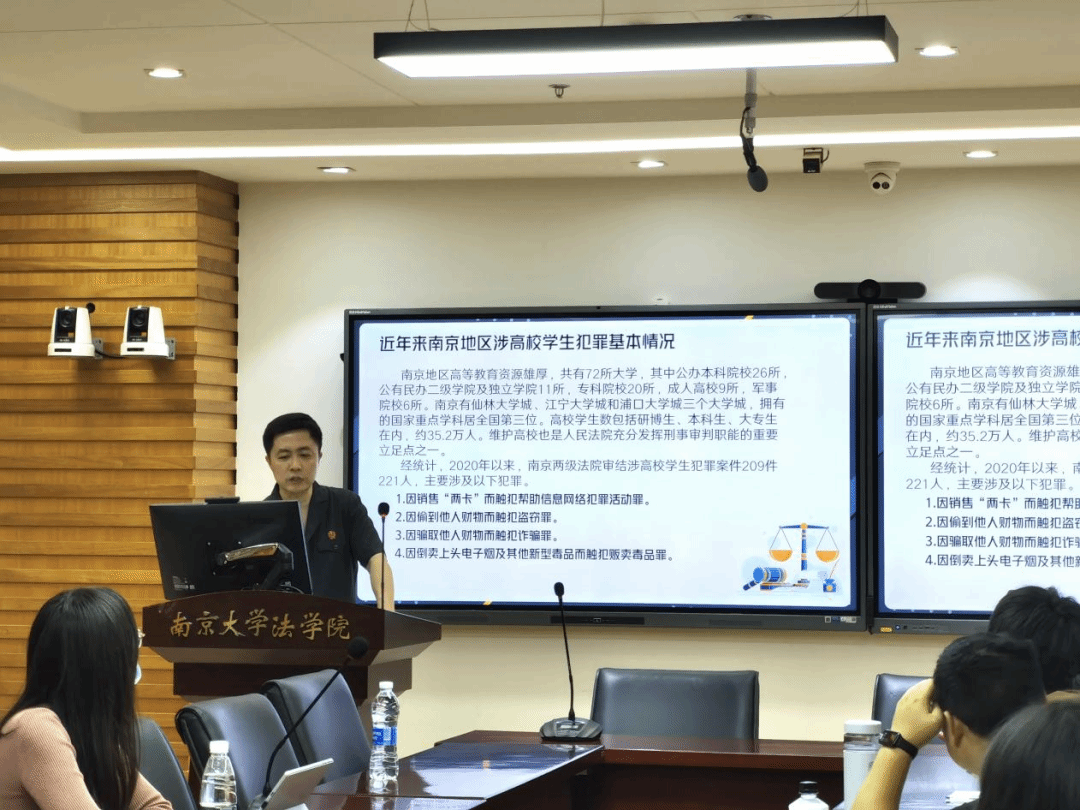 研究生团总支、2021级法学硕士团支部共同承办。南京市中级人民法院刑一庭法官、南大校友周晓作为主讲人,针对案件办理过程中遇到的高校学生犯罪类型进行法治宣讲,重点分享了当前“帮信”刑事案件的形态、特点及其防范对策。市法院刑一庭法官助理刘婷婷、2021级法学硕士团支部学生参与了活动。