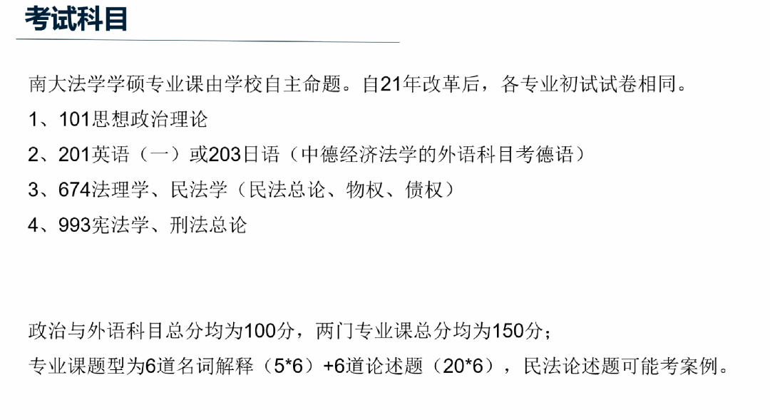南大法学学硕专业课由学校自主命题,在2021年考试改革后,不同专业的初试考试科目相同。初试分为四科,思想政治理论、英语(一)或日语(中德经济法学的外语科目为德语)、专业课一(法理学、民法学)、专业课二(宪法学、刑法学)。其中专业课(一)的难度高于专业课(二),同时需要注意的是p站视频