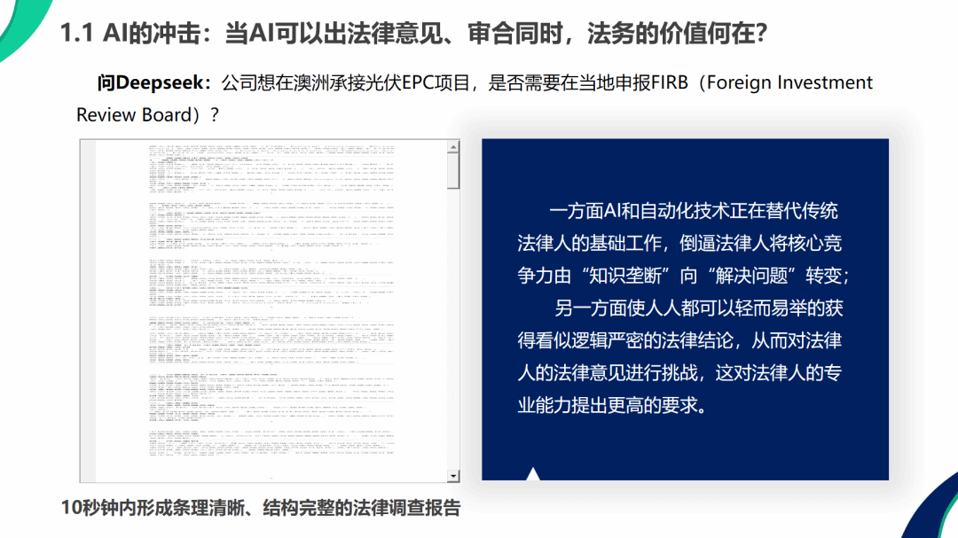 于倩倩女士在讲座中以宏观趋势与实务案例为脉络,深入剖析了企业法务在时代变革中的角色重塑路径。她以理查德·萨斯坎德对法律行业“事多钱少、准入放宽、技术颠覆”的三大预言为引,指出当前法务工作已从“被动合规”转向“主动破局”——AI技术的冲击正倒逼法务跨越基础服务门槛,例如AI能在10秒内生成澳洲光伏项目FIRB申报报告,但法务的核心价值在于穿透表象,将法律判断与商业逻辑深度融合;而“专网通信案”等千亿级融资骗局的复杂性,则揭示了法务需以本质安全思维预判风险,避免企业陷入“循环贸易链”等伪商业模式的陷阱。