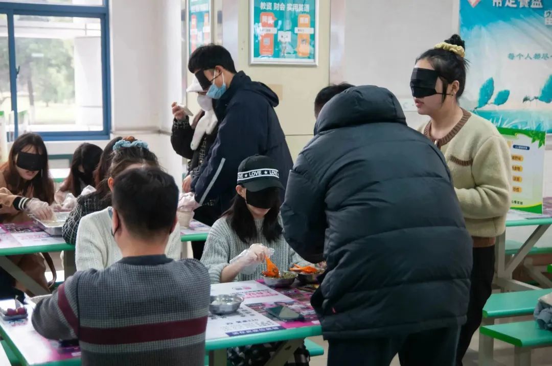 每组四个同学蒙眼合作,第一人原地转三圈给第二人传饺子皮,第二个人放馅,第三个人合饺子,第四个人放在指定位置,剩下的第五个人提供指引。规定的时间内成型的一个饺子计一分。