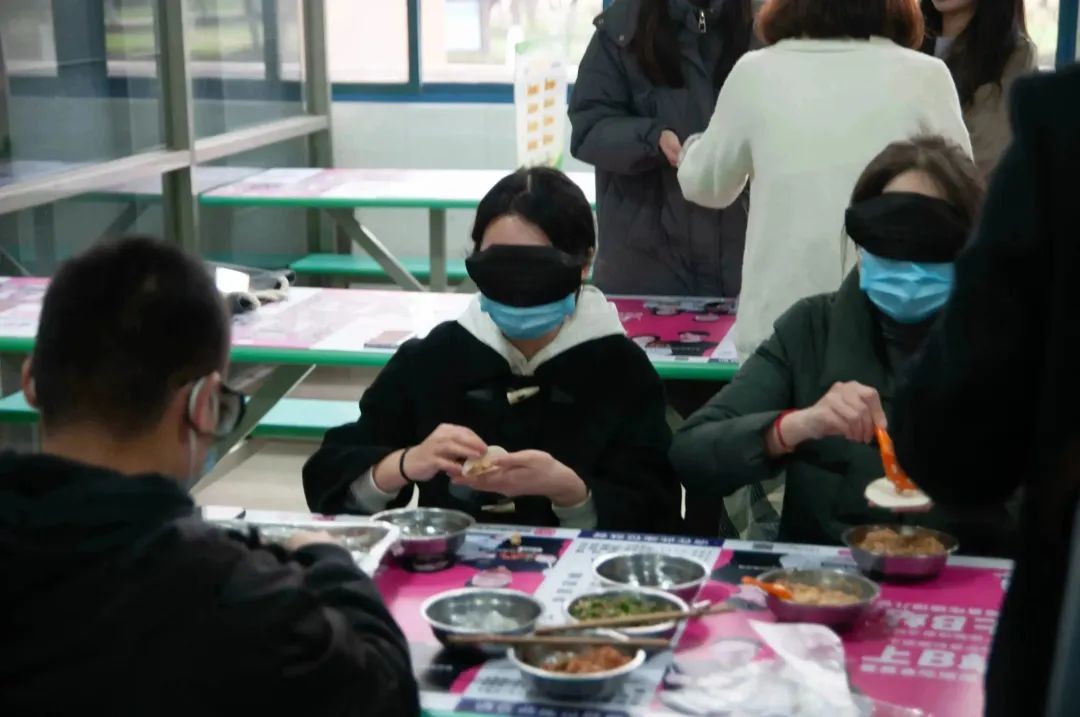 戴上眼罩后,起初大家都很不适应,要么找不到下一个人的手,要么馅放太多合不起来,手忙脚乱,不知所措,笑料百出。