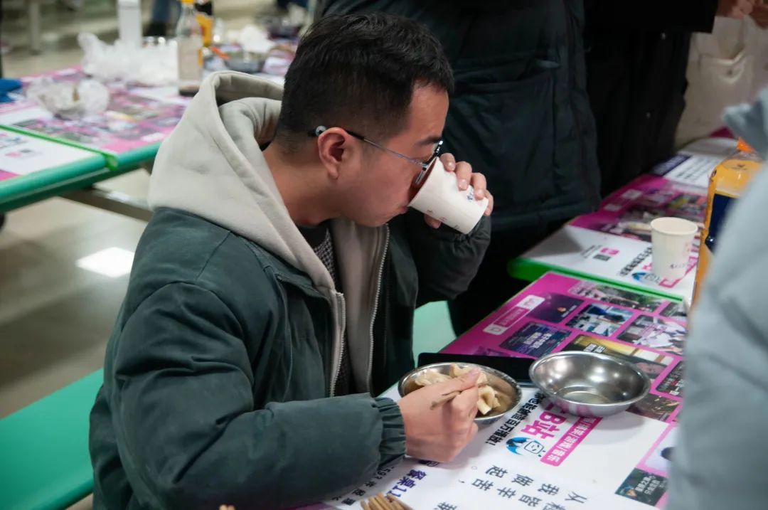 包饺子环节结束后,同学们将饺子送去下锅。不一会儿,第一批热腾腾的饺子出锅了,形态各异、白白胖胖、有模有样,同学们一个个都迫不及待挑出自己的杰作,并尽情品尝一番。别急!咱们这一锅饺子可是大胃王们的“特供福利”呢!