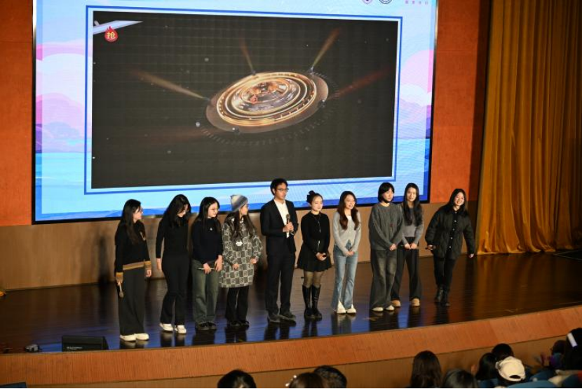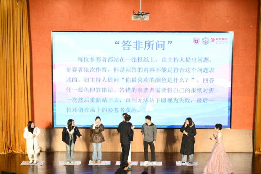 精彩的说唱表演后,进入到了欢快的游戏环节。本轮游戏名称为“答非所问”,现场共有六位同学积极参与,每位参与者都展现了出色的反应能力,最终大家都收获了精美明信片,为晚会增添了无限乐趣。