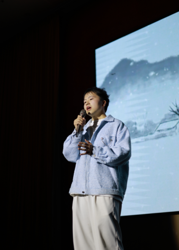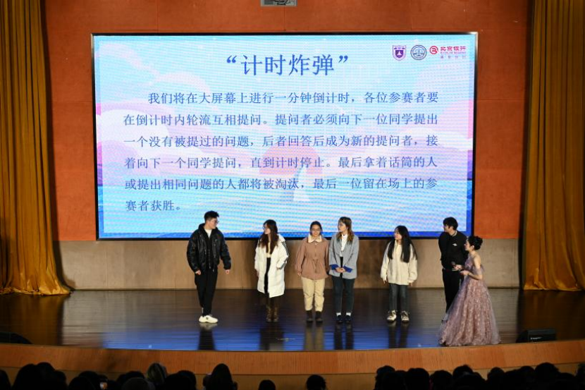 第三篇章的表演结束后,又到了精彩的游戏环节。在本轮“计时炸弹”游戏中,参赛者迅速回答前一名同学提出的问题,又马上向下一名同学抛出不同的问题。随着一次次紧张刺激的话筒传递,有人不假思索“已读乱回”,有人思维跳脱“张口就来”,最终,一名同学打败其他所有对手,成为了本次游戏的获胜者!