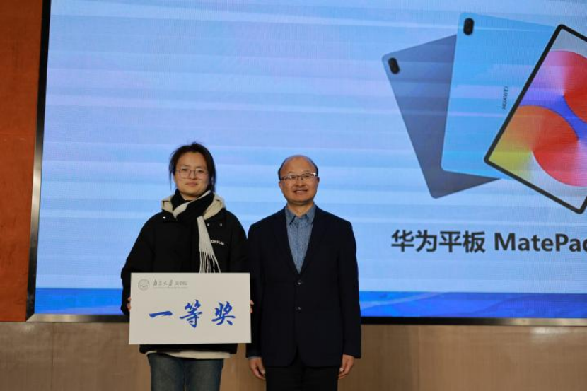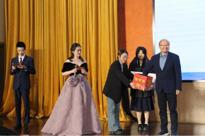 第一篇章表演结束,到了激动人心的抽奖环节。本轮三等奖由党委副书记马骏老师为我们抽取。恭喜以上三位幸运同学分别获得精美的罗技键盘、富士拍立得和SKG肩颈按摩仪!
