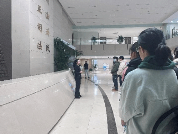 首先,法官助理带领同学们参观了诉讼服务大厅,她不仅向同学们介绍了安检通道、立案窗口、缴费窗口和智能网上立案系统,还向同学们介绍了南京市中级人民法院的制服变迁、判决书迭代、建院历程和历代院址。