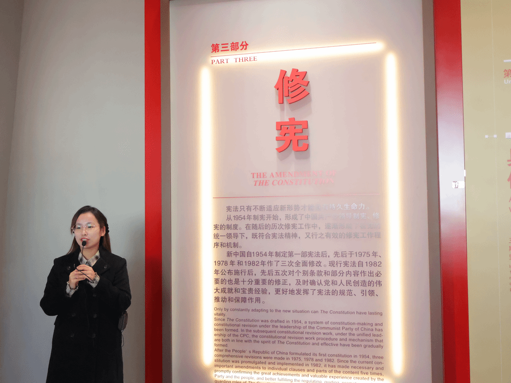 宪法只有不断适应新形势,才能具有持久的生命力。新中国自1954年制定第一部宪法后,先后于1975年、1978年和1982年对宪法作了三次全面修改。宣讲志愿者结合模拟工作场景以及视频放映向同学们一一讲解修宪历程。