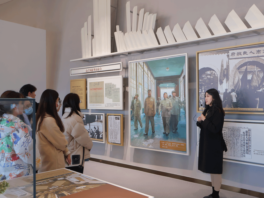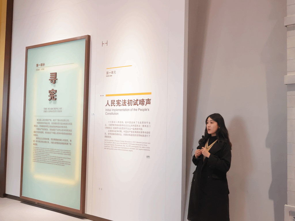 从“十月革命一声炮响”到“中国人民当家作主”,讲解志愿者向同学们分别介绍了中国共产党在土地革命时期、抗日战争时期、解放战争时期所制定的一系列为建立新型政治制度积累了实践经验的宪法性法律文件。