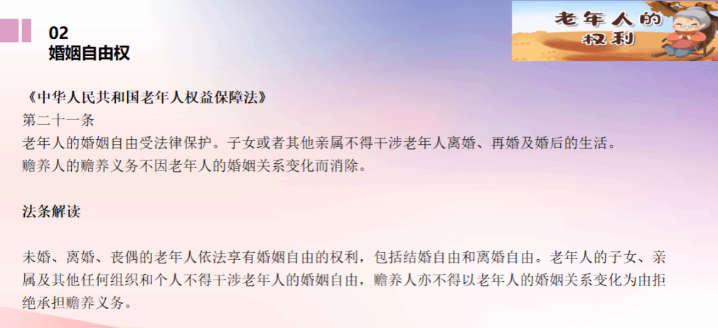 来自2023级法律硕士班的志愿者张鹏辉从老年人权益保护相关的法律法规入手,重点介绍了《老年人权益保护法》和《民法典》中规定的受赡养和扶养权、婚姻自由权、自主处分财产权、法定社会保障权以及享受社会优待的权利等重点权利。针对不同的情况,志愿者分别介绍了在合法权益受到侵害时,老年人可以采取何种途径维护自身合法权益。