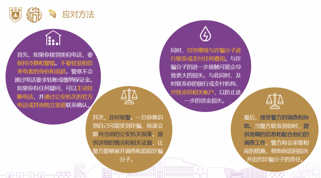 最后,结合相关案例,志愿者为大家讲解了遇到相似情形、接到类似电话时的应对方法:首先,不轻信来电者的身份和说辞、通过可靠渠道确认电话内容真实性;其次,一旦意识到自己可能受到诈骗,立即向当地公安机关报案并提供详细情况和相关证据;再次,切勿继续与诈骗分子进行联系或支付任何费用;最后,配合警方的调查工作。此外,志愿者还提醒大家切勿轻易泄露个人信息、尽量避免点击不明来源的链接、警惕社交工程攻击以及遇到可疑情况应当立即报警。
