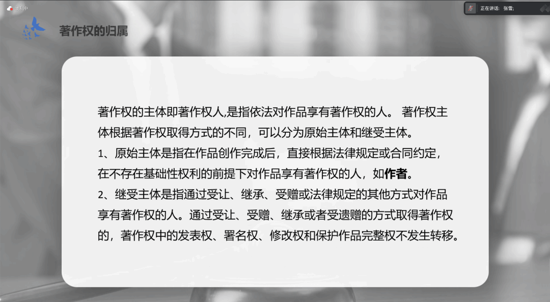 张雪同学首先以一个诗歌鉴赏投稿的案例引出了著作权保护的话题,通过一系列问题互动和热点案例分析,深化了同学们对著作权概念的认识,使同学们明确了文学创作中权利和义务的边界,为进一步学习著作权归属问题奠定了理论基础。