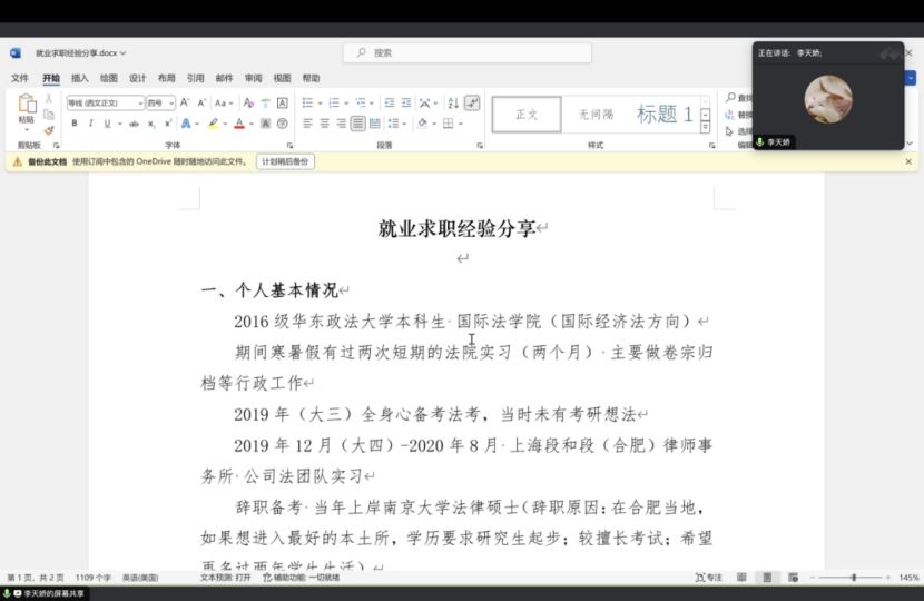 在工作体验上,李天娇学姐分享了律师工作给她带来的个人成长:专业能力的提升、学生思维的转变以及商业思维的培养,也坦率地向我们展现了律师这一职业在工作时间、前期生存压力等方面可能会遭遇的困难和挑战。
