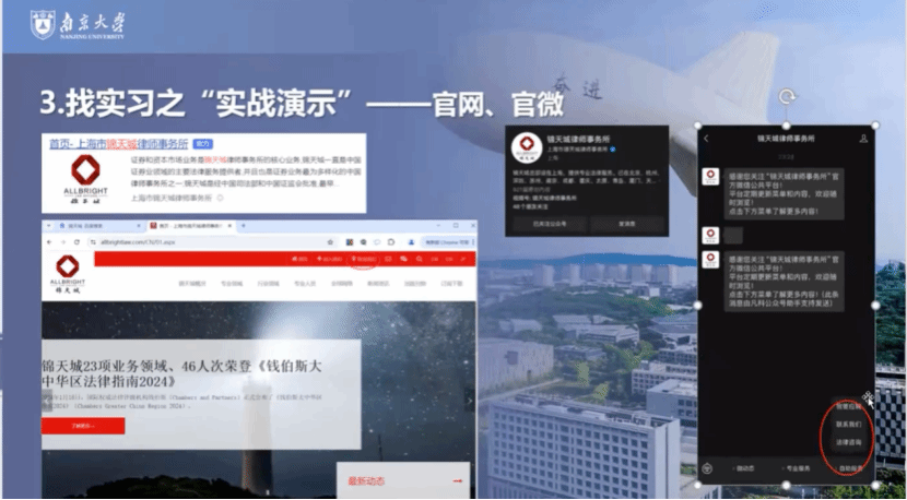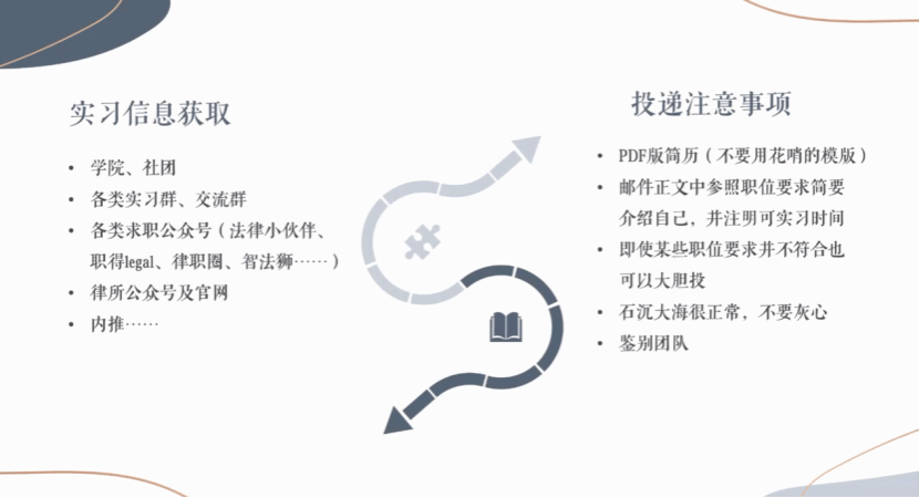 樊力争学姐主要分享自己在律所证券部和公司法务部的实习经验,以及一些实习的小tips。