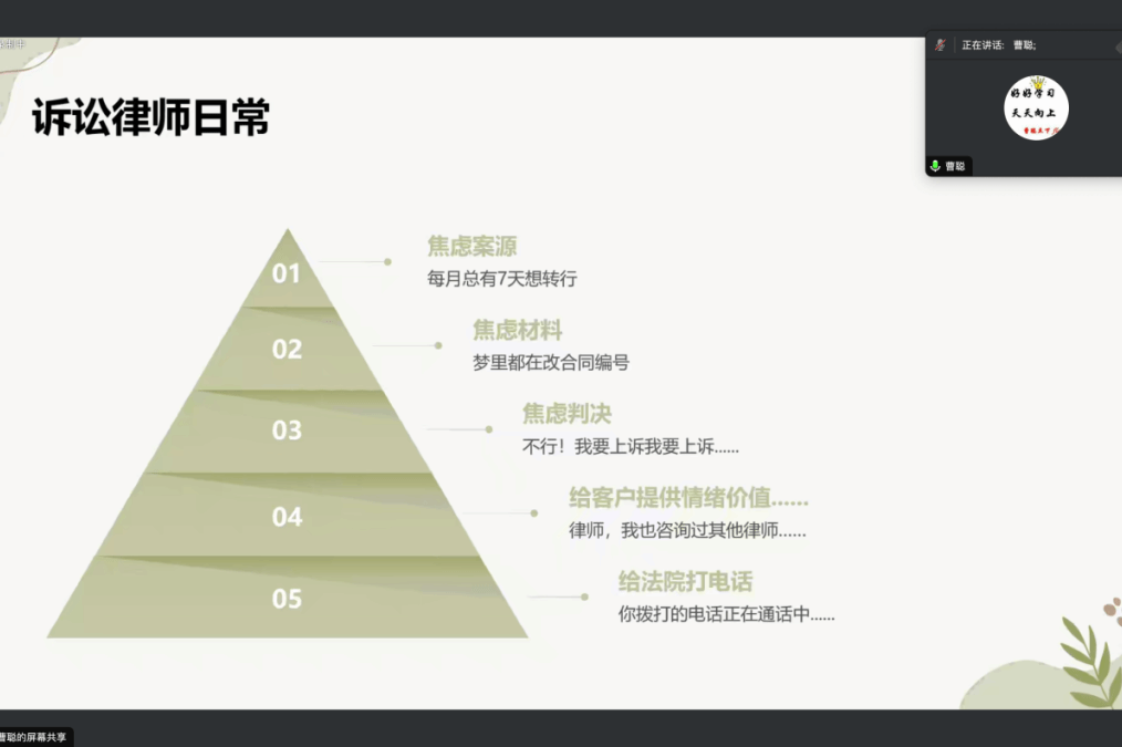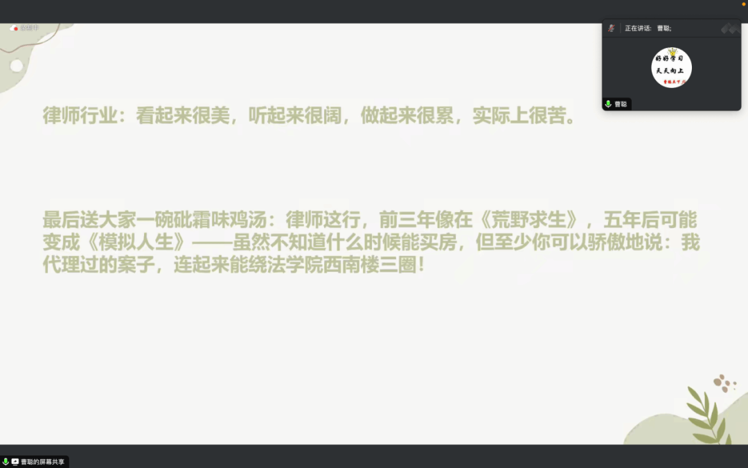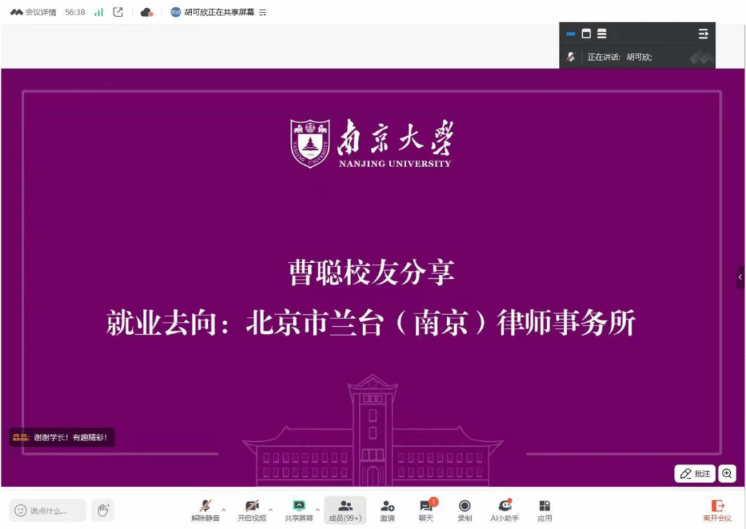 曹聪学长的分享从“职业选择”“在校修炼手册”“律师行业生存图鉴”三个方面展开。他首先从律所和法务工作的不同特点出发,分享了自己从央企法务向律师工作转向的原因。随后基于自身经验为在校同学提出了建议:读研期间可以以实习和成绩两方面作为抓手,一方面要通过关注学院实习群、联系校友等方式多主动争取实习机会,以提升自己的专业素养;另一方面也要注重课程学习,尤其是认真对待同今后执业方向可能相关的专业课程。