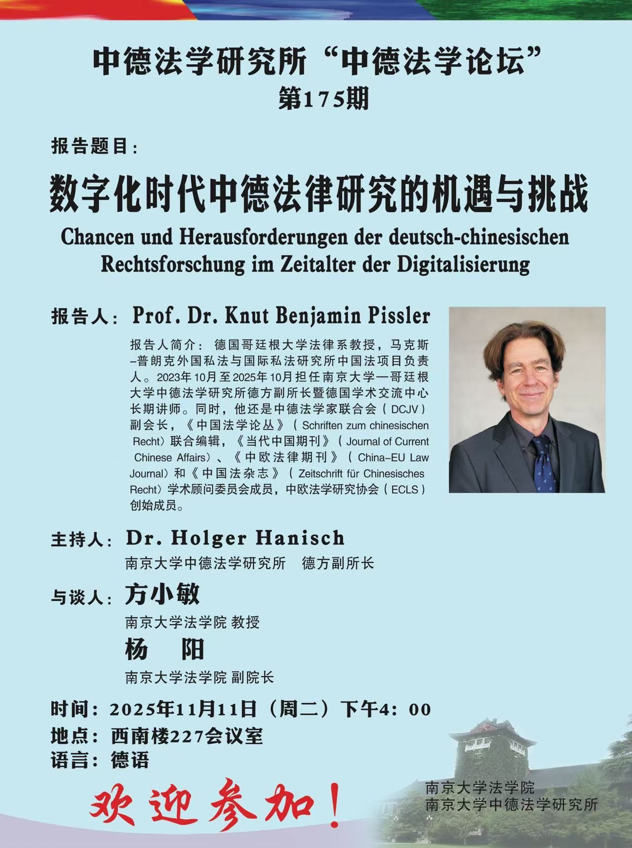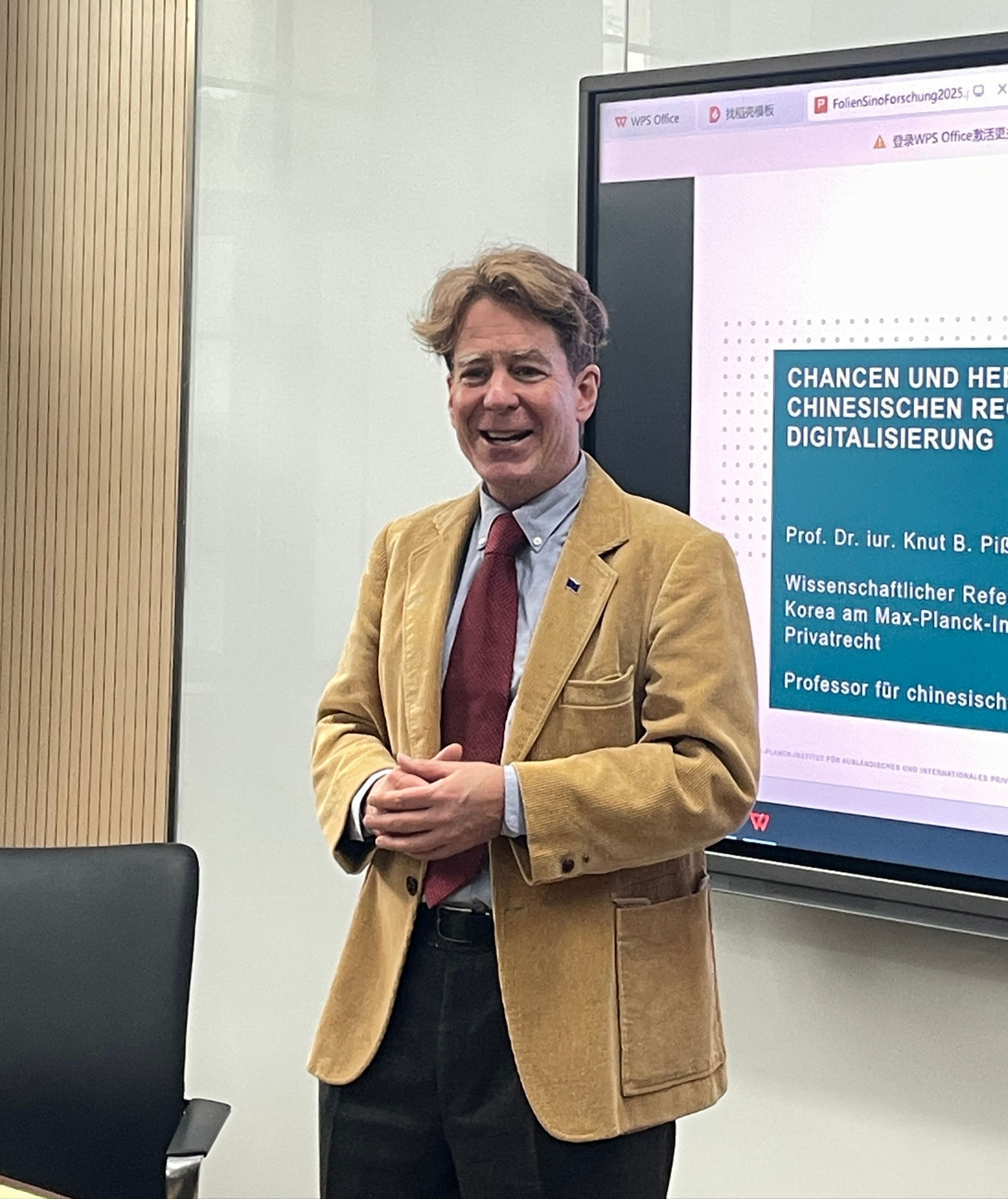 2025年11月11日,应p站视频 中德法学研究所邀请,德国哥廷根大学法律系教授、马克斯-普朗克外国私法与国际私法研究所中国法项目负责人Knut Benjamin Pissler以《数字化时代中德法律研究的机遇与挑战》为题,为第175期“中德法学论坛”做学术讲座。