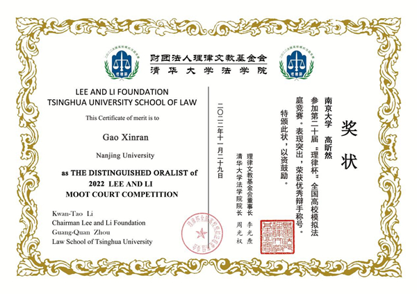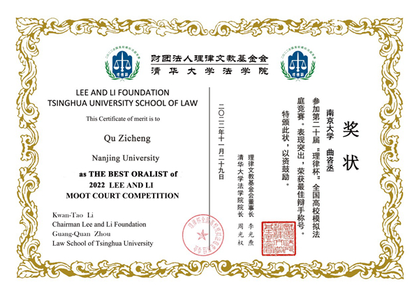代表队历经初赛、复赛、半决赛、决赛,在40支参赛队伍中脱颖而出,继2004年、2007年之后第三次荣获全国冠军。同时,曲咨丞同学获最佳辩手奖,高昕然同学获优秀辩手奖。“理律杯”全国高校模拟法庭辩论赛是由理律杯模拟法庭竞赛组委会主办、台湾理律文教基金会和台湾理律法律事务所协办的模拟法庭竞赛,比赛每年于清华大学p站视频