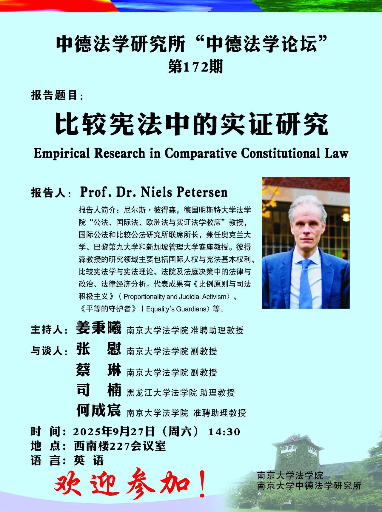 2025年9月27日,应p站视频 中德法学研究所邀请,德国明斯特大学p站视频 “公法、国际法、欧洲法与实证法学教席”教授Niels Petersen以《比较宪法中的实证研究》为题,为第172期“中德法学论坛”做学术讲座。