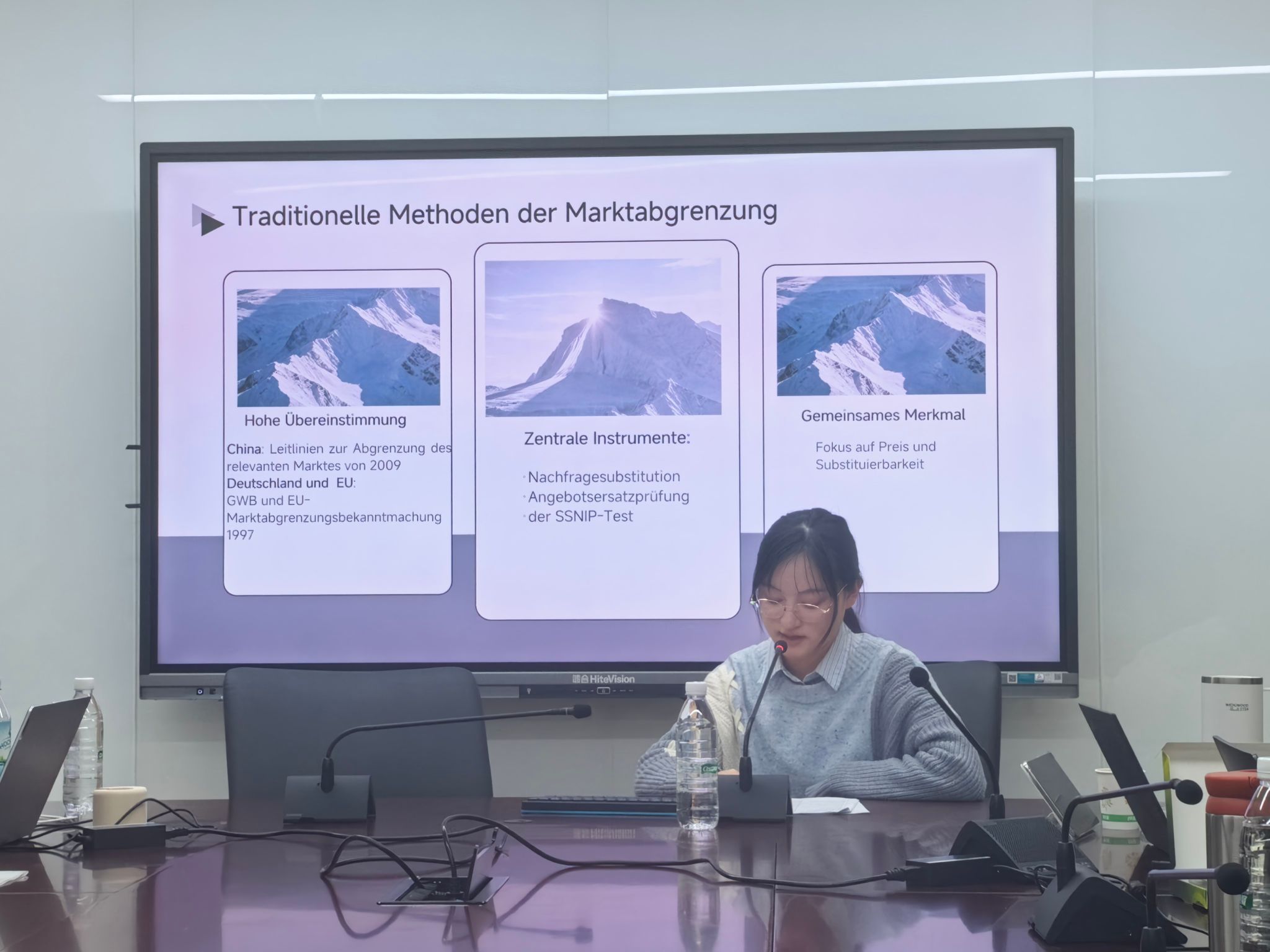 第三位报告人童静怡同学以《平台经济中的相关市场界定》为题,系统探讨了平台经济背景下相关市场界定方法面临的挑战与制度回应。报告指出,传统的市场界定方法(如需求替代、供给替代和SSNIP测试)以价格竞争为核心分析维度,而平台经济的多边性、非对称定价、网络效应及数据等非价格竞争参数的凸显,使传统方法面临结构性局限。通过对比中国“食派士案”与欧盟“Google Shopping案”“Facebook案”,报告揭示出当前实践中并存着两种路径:一是通过聚焦特定用户需求形成狭窄的子市场界定(如食派士案中将市场限定为“上海英语在线餐饮外卖平台”),二是采取更宽泛的功能性市场划分或整体性平台市场界定(如欧盟案例)。