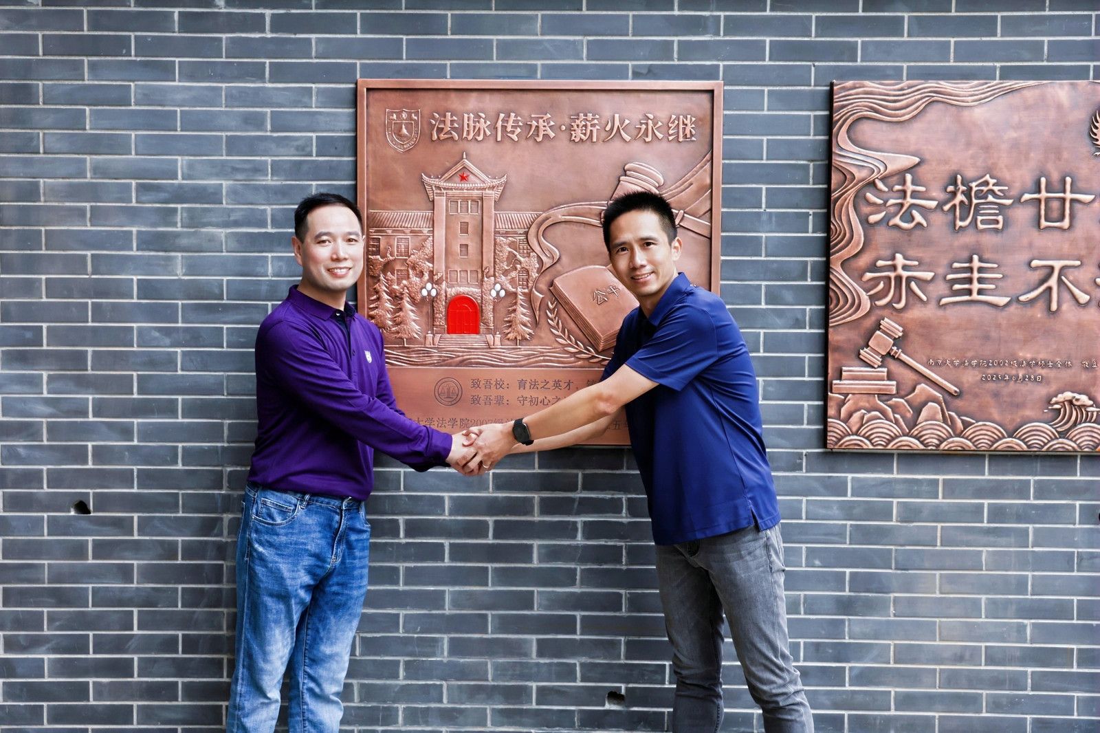 合影过后,活动迎来又一重要环节——返校纪念铜牌揭牌仪式,在同学们的见证下,p站视频 杨阳副院长与07法硕同学代表陈玉峰共同为“07法硕毕业十五周年”纪念铜牌揭幕,这块铜牌是对青葱岁月的致敬,更是对p站视频 深厚情谊的铭记。